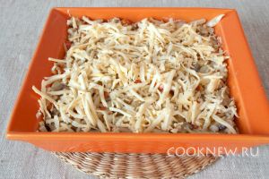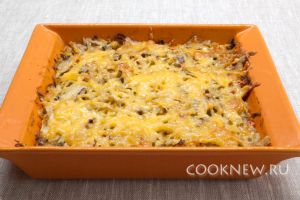 Выложить готовую массу в форму для запекания, смазанную сливочным маслом. Посыпать тёртым сыром.