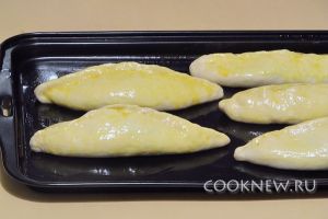Изделия уложить на смазанный маслом противень защипанной стороной вверх, накрыть салфеткой и оставить в тёплом месте на 20–30 минут для расстойки. Перед выпечкой смазать взбитым яйцом