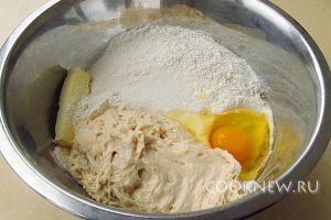 Когда объём опары увеличится вдвое, добавить муку, яйца, сливочное масло, сахар и соль