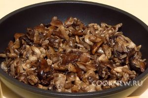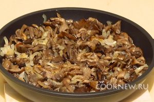 Выложить лук к грибам, перемешать, посолить и прогреть ещё в течение 5 минут. При желании в начинку можно положить немного сметаны