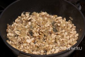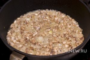 Разогреть 1-2 столовые ложки растительного масла и обжарить лук с грибами 5-7 минут