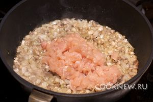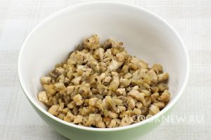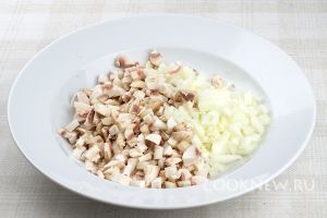 Тем временем приготовим начинку. Грибы и лук порезать кубиками