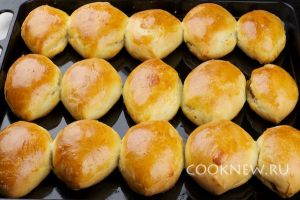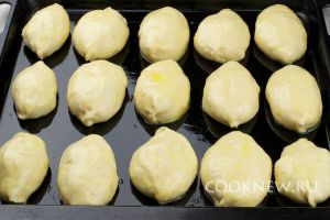 Смазать противень растительным маслом и выложить пирожки швом вниз. Затем взбить 1 яйцо и смазать пирожки, чтобы при выпекании они получились румяными