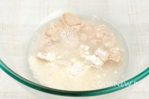 Начнём с опары — соединить дрожжи, тёплую воду, столовую ложку муки и чайную ложку сахара