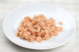 Куриное филе хорошо помыть и так же порезать кубиками.