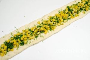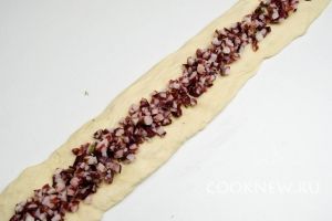 ретью полосу наполнить мелко нарезанной колбасой. Закрыть и хорошо защипить края пальцами