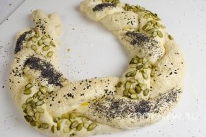 Подпылить поверхность стола мукой. Разложить на пергаменте части косы швом вниз. Смазать небольшим количеством желтка и присыпать каждую из них разными семенами