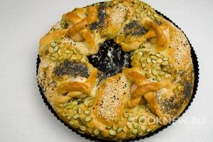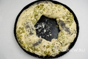Соединить концы косы в кольцо, чтобы получился венок. Выложить с пергаментом на противень или в подготовленную широкую форму для выпечки пиццы или хлеба.