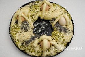 Выпекать венок 50-60 минут при температуре 180°C. Во время выпечки дверцу духовки не открывать, чтобы яйца не треснули! Готовый хлеб вынуть из духовки. Сбрызнуть водой. Накрыть салфеткой. В форме остудить 5-7 минут