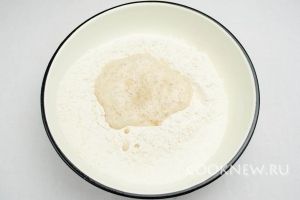 Подошедшие дрожжи залить в лунку муки. Замесить тесто, подливая оставшуюся тёплую воду