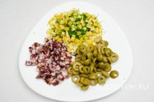 Тем временем подготовить начинку. Нарезать кольцами маслины, мелким кубиком колбасу, сыр (к нему добавить резаный укроп)