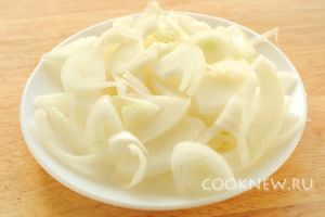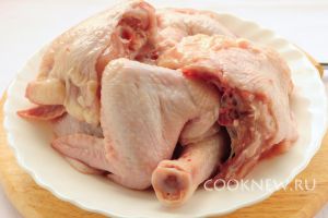 Курицу промойте под проточной водой, обсушите бумажным полотенцем и нарежьте на порционные куски