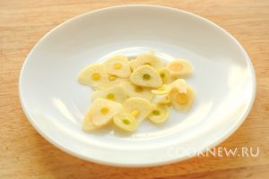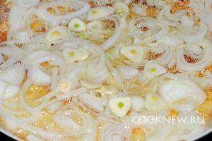 Вынимаем куски курицы и в той же сковороде обжариваем лук с чесноком 2-3 минуты