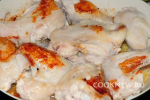 Как только жидкость начнёт кипеть, убавляем огонь и тушим под крышкой 30-35 минут (до готовности курицы).