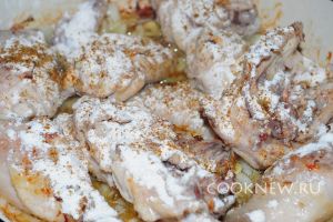 Возвращаем курицу, солим, посыпаем мукой и специями