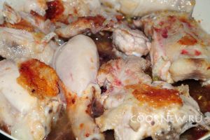 На разогретую сковороду со сливочным маслом выкладываем куски курицы и обжариваем на сильном огне с двух сторон до золотистой корочки (примерно по 3 минуты с каждой стороны)