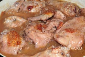 Возвращаем куски курицы в сковороду и курица в вине по-французски готова. Подавать со стручковой фасолью, присыпав рубленой зеленью