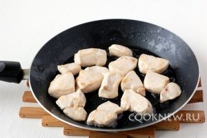 Куриную грудку порезать средними кусочками и обжарить на растительном масле по 1 минуте с каждой стороны