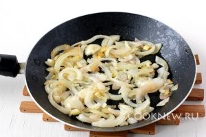 Лук порезать полукольцами. Слегка обжарить на растительном масле.