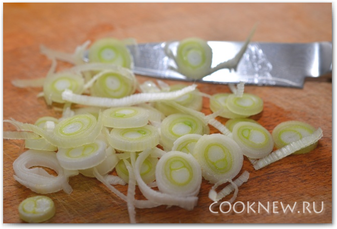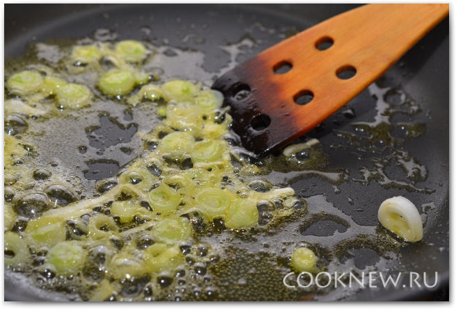 Добавляем лук (белую часть), обжариваем примерно 30 секунд