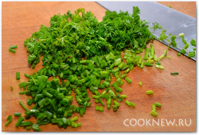 Мелко нарезаем петрушку и зеленый лук (всю зелёную его часть). Должно получиться примерно 3 ст.л. зелени.