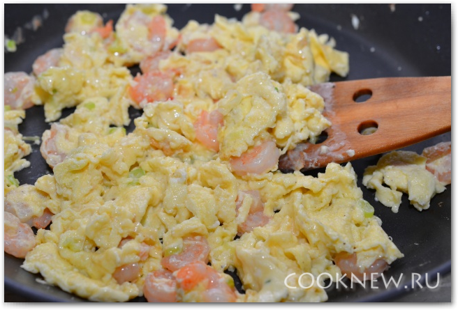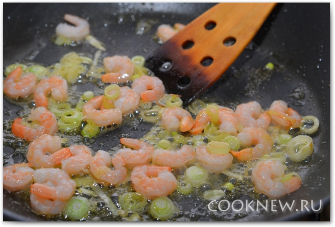 Добавляем креветки, обжариваем ещё 30 секунд