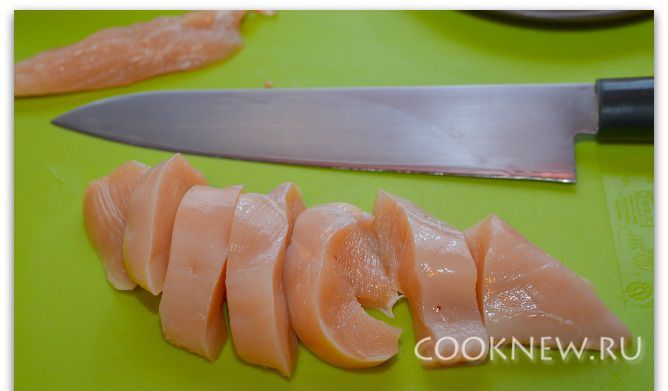Нарезаем филе кусочками толщиной около 1 см.