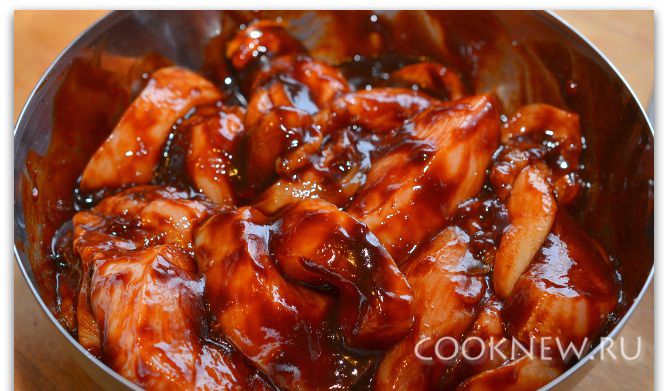 Перемешиваем кусочки филе с маринадом