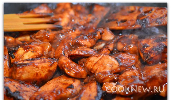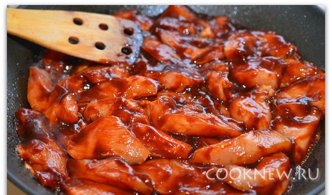 Нагреваем масло в сковороде. Выкладываем куриное филе вместе с маринадом и жарим, не переворачивая, около 5ти минут. Если маринад будет сильно брызгать из сковороды, надо накрыть сковородку специальной сито-крышкой.