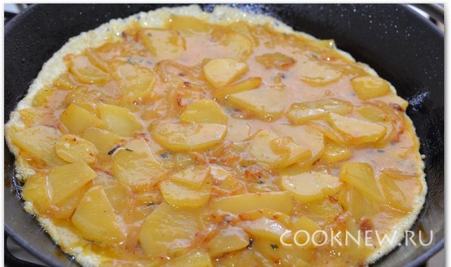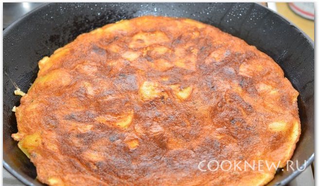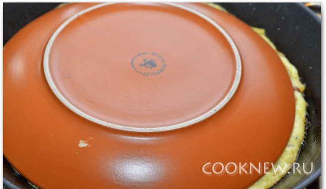 Затем выкладываем омлет из тарелки обратно в сковороду, омлет должен как бы соскользнуть из тарелки в сковороду. Жарим уже без крышки ещё 2-3 минуты
