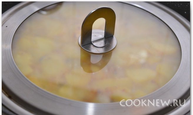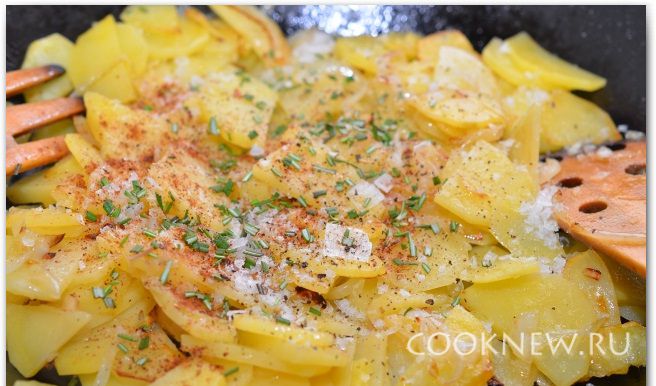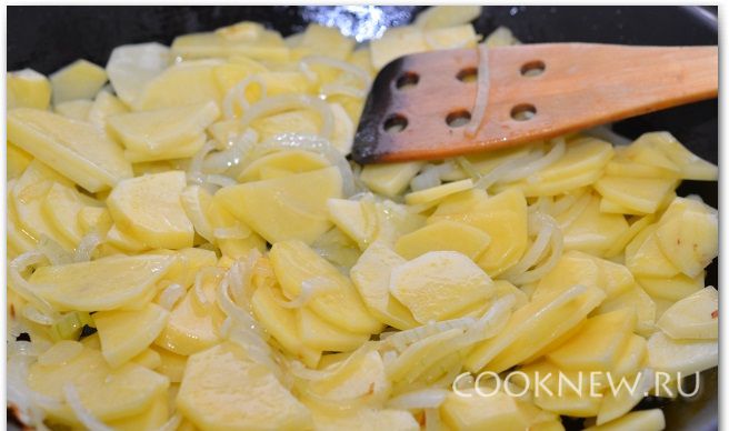 Как только лук стал мягкий, выкладываем картофель, хорошо перемешиваем и жарим до готовности примерно 10-15 минут. В течении жарки помешиваем картошку, чтобы она не зажаривалась.