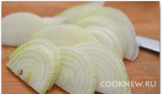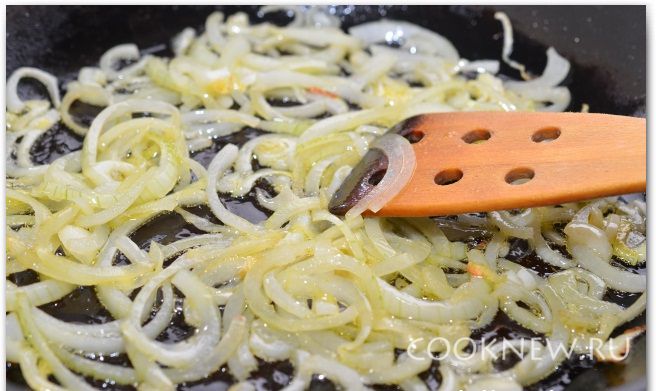 Разогреваем оливковое маслов сковороде, выкладываем лук и обжариваем, пока лук не станет мягкий и прозрачный, НЕ зажариваем до золотистого цвета!