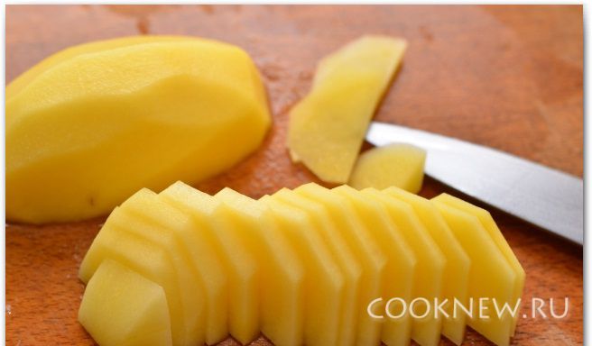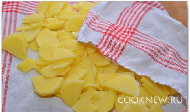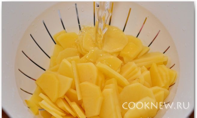 Ополаскиваем картофель водой, чтобы смыть крахмал. Так картофель не будет слипаться при жарке.