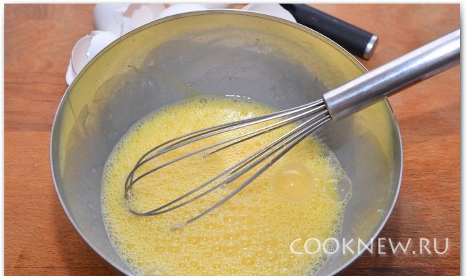 Выкладываем получившуюся массу на сковороду. Если вы не уверены, в том что омлет может пристать к сковороде, и потом плохо преревернуться и разломаться, то лучше быстро помыть сковороду перед тем, как выкладывать массу, и заново смазать растительным маслом