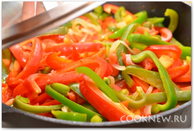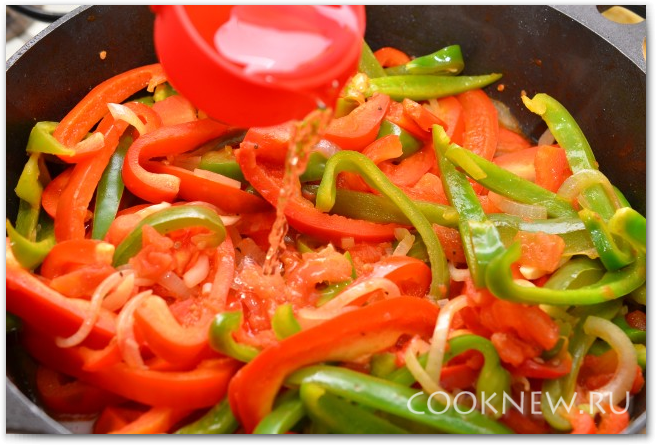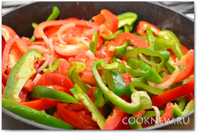 Если в сковороде образовалось много жира, слейте его, чтобы осталась примерно 1 ст.л. Выкладываем в сковороду лук, чеснок, перец и помидоры. Убавляем огонь до минимума и тушим 10 минут