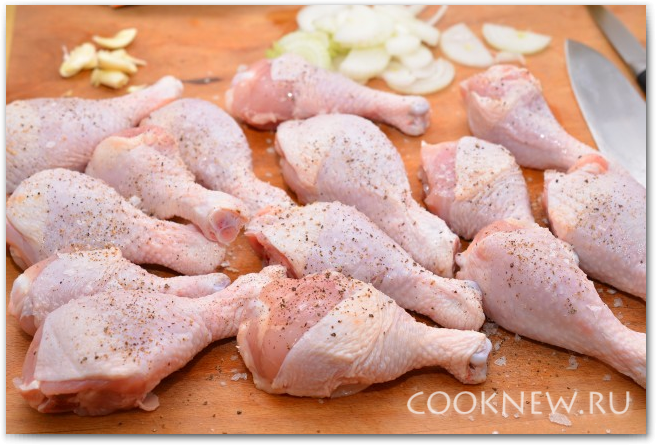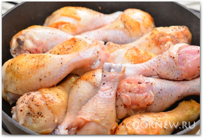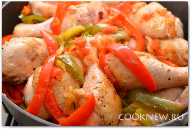 Далее перекладываем курицу в сковороду, солим и перчим, аккуратно перемешиваем с овощами, накрываем крышкой и тушим еще 15-20 минут, или до готовности курицы. Готовность можно проверить, проткнув курицу вилкой или острым ножом, вытекающий сок должен быть прозрачный