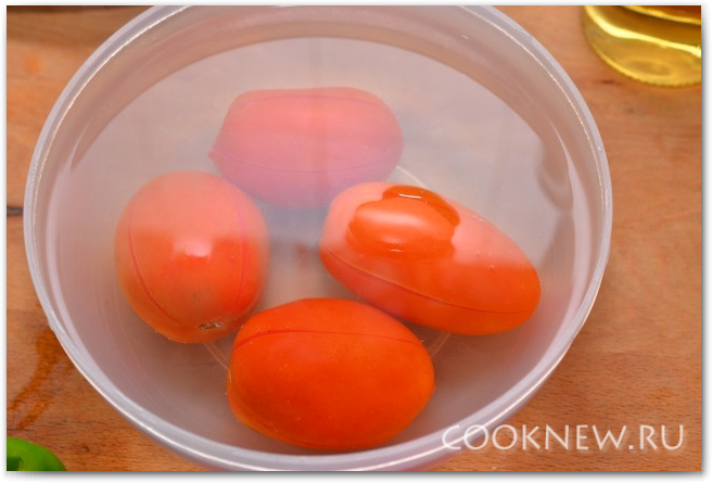 Чистим помидоры, делаем крестообразные надрезы на помидорах и заливаем их кипятком буквально на минуту.
