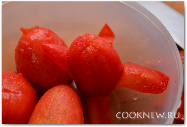 Далее сливаем воду и очищаем помидоры от кожуры