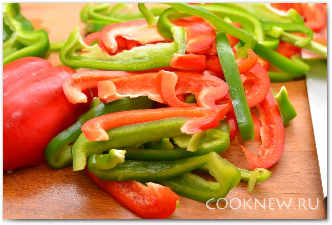 Разрезаем перец пополам, очищаем от семян и мембран. Нарезаем длинными полосками