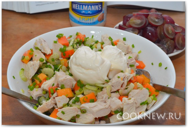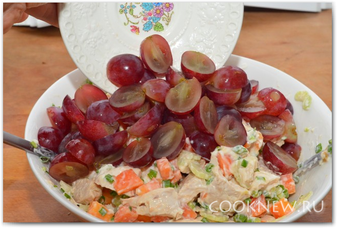 В самом конце добавляем виноград, аккуратно перемешав салат окончательно