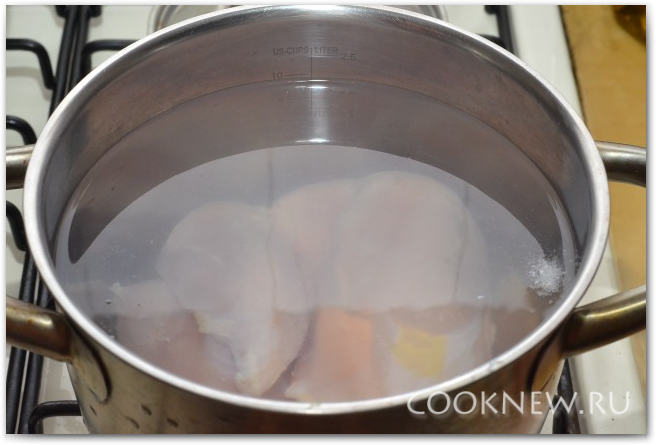 Ставим вариться куриное филе. Заливаем его холодной водой, солим, ставим на большой огонь. Филе будет готово примерно через 20 минут, после того как закипит вода. Готовое филе выкладываем остужаться.