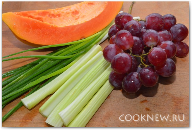 Моем лук, сельдерей, виноград и чистим папайю от косточек и шкурк