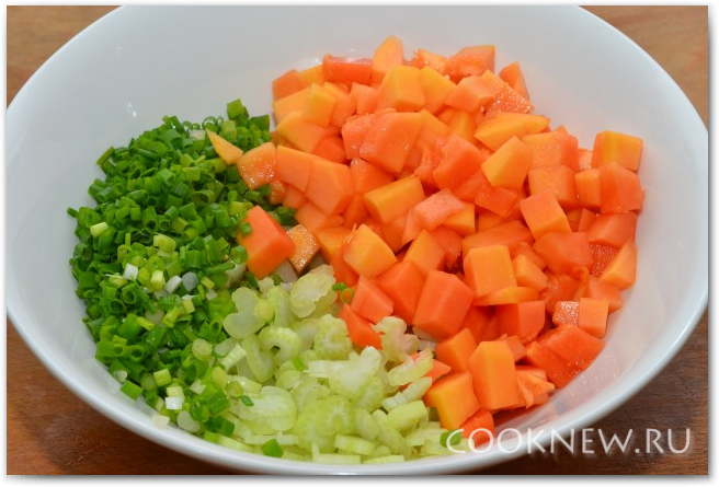 Аккуратно смешиваем лук, сельдерей, папайю. Добавляем майонез и хорошенько перемешиваем снова