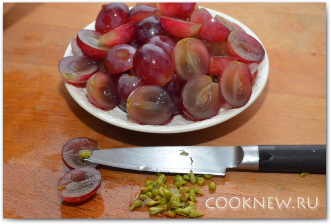 Виноград разрезаем пополам и удаляем косточки (если есть) острым ножом. Складываем виноград отдельно
