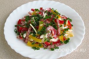 Полить салями и овощи сметанной заправкой