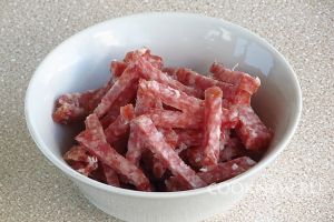 Салями очистить от оболочки и нарезать тонкими брусочками