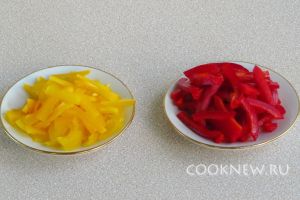 Плоды сладкого перца очистить от плодоножек и семяносцев с семенами, разрезать на четвертинки, а затем каждую четвертинку нашинковать соломкой.