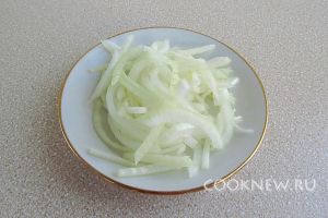 Луковицу очистить, разрезать пополам и каждую половинку нарезать тонкими полукольцами.