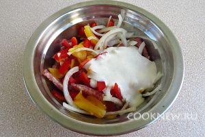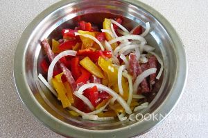 В миске соединить перец, салями, лук и чеснок и перемешать