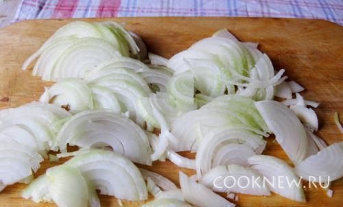 Лук почистите и нарежьте полукольцами, обжарьте его в сливочном масле.